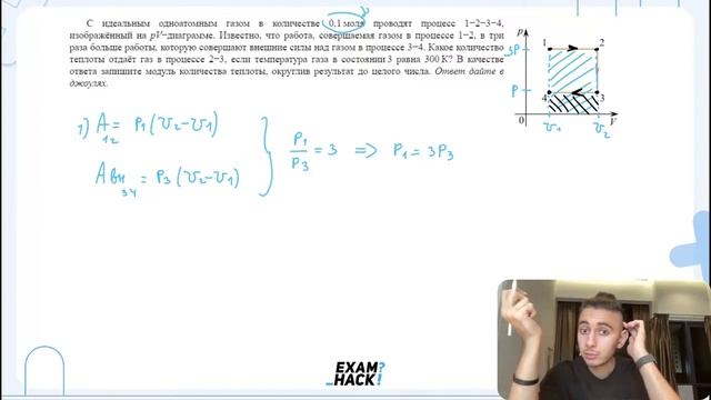С идеальным одноатомным газом в количестве 0,1 моля проводят процесс 1−2−3−4, изображённый - №30068