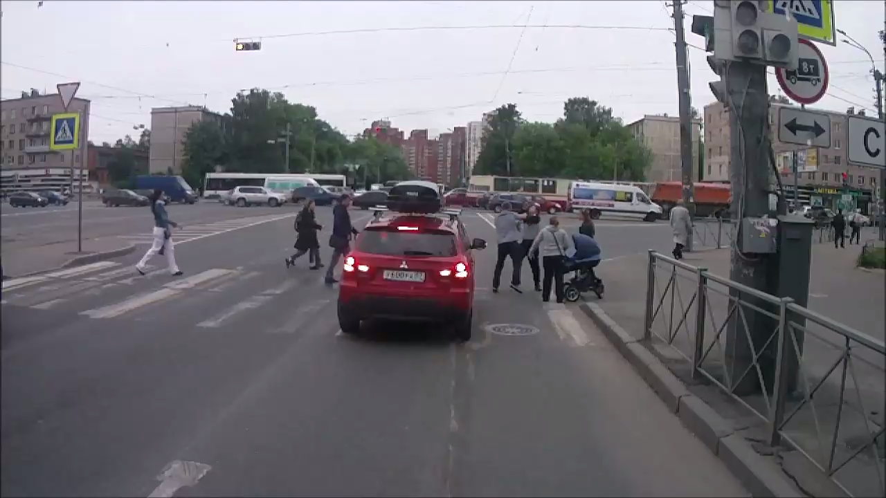 Женщина останавливается на пешеходном переходе, перегораживая путь людям. Мужчина с коляской пинает автомобиль, а затем бросает коляску и лезет в драку с пассажиром автомобиля. Регик ездит по тротуарам. Музыка из магнитолы... ) #переход #регистратор #драка