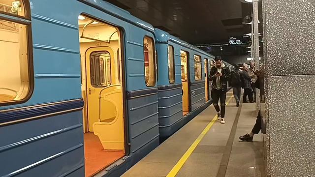 Еж3 с парада поездов уезжает со станции Метро Кунцевская.