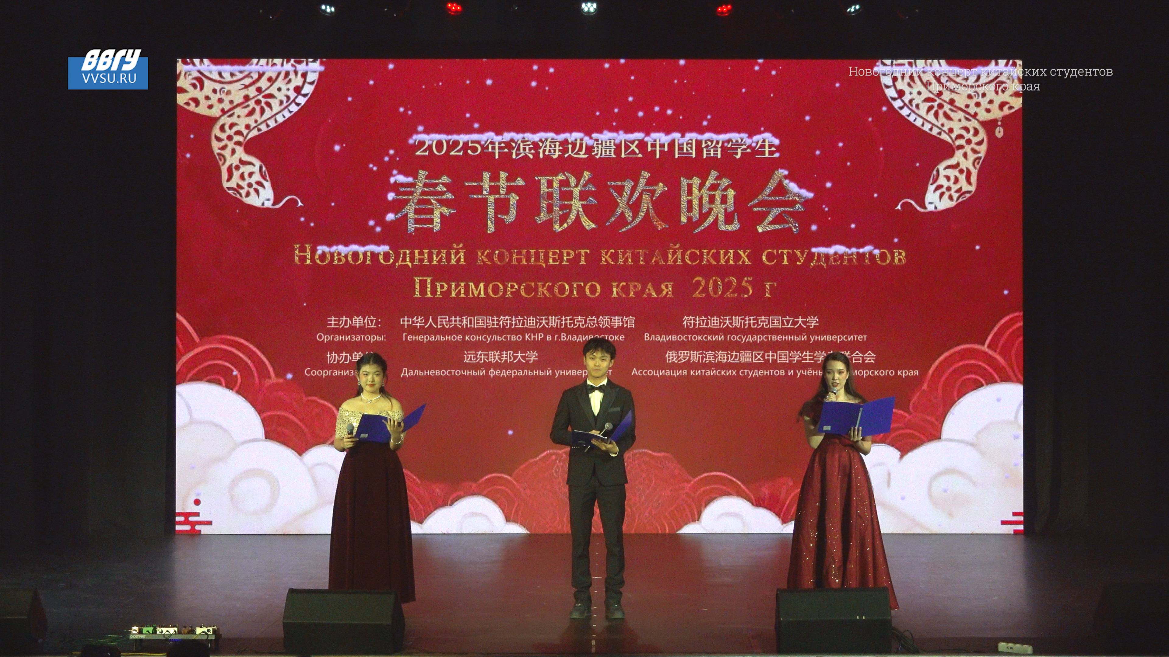 Во Владивостокском государственном университете прошёл яркий новогодний гала-концерт с участием российских и китайских студентов. Событие было организовано ВВГУ и генеральным консульством Китайской Народной Республики во Владивостоке при содействии объединения китайских студентов и учёных Приморского края. Почетными гостями мероприятия стали генеральный консул КНР в городе Владивостоке Пяо Янфань, заместитель главы администрации города Владивостока Дарья Стегний, руководитель представительства Министерства иностранных дел России во Владивостоке Андрей Броварец, проректор по международным связям ДВФУ Евгений Власов, ректор государственного автономного учреждения дополнительного профессионального образования «Приморский краевой институт развития образования» Татьяна Мельникова и проректор по стратегическому развития системы общего образования Ксения Михалёва, заместитель генерального консульства КНР во Владивостоке господин Ван Цзюнь и Юй Зуцзе.