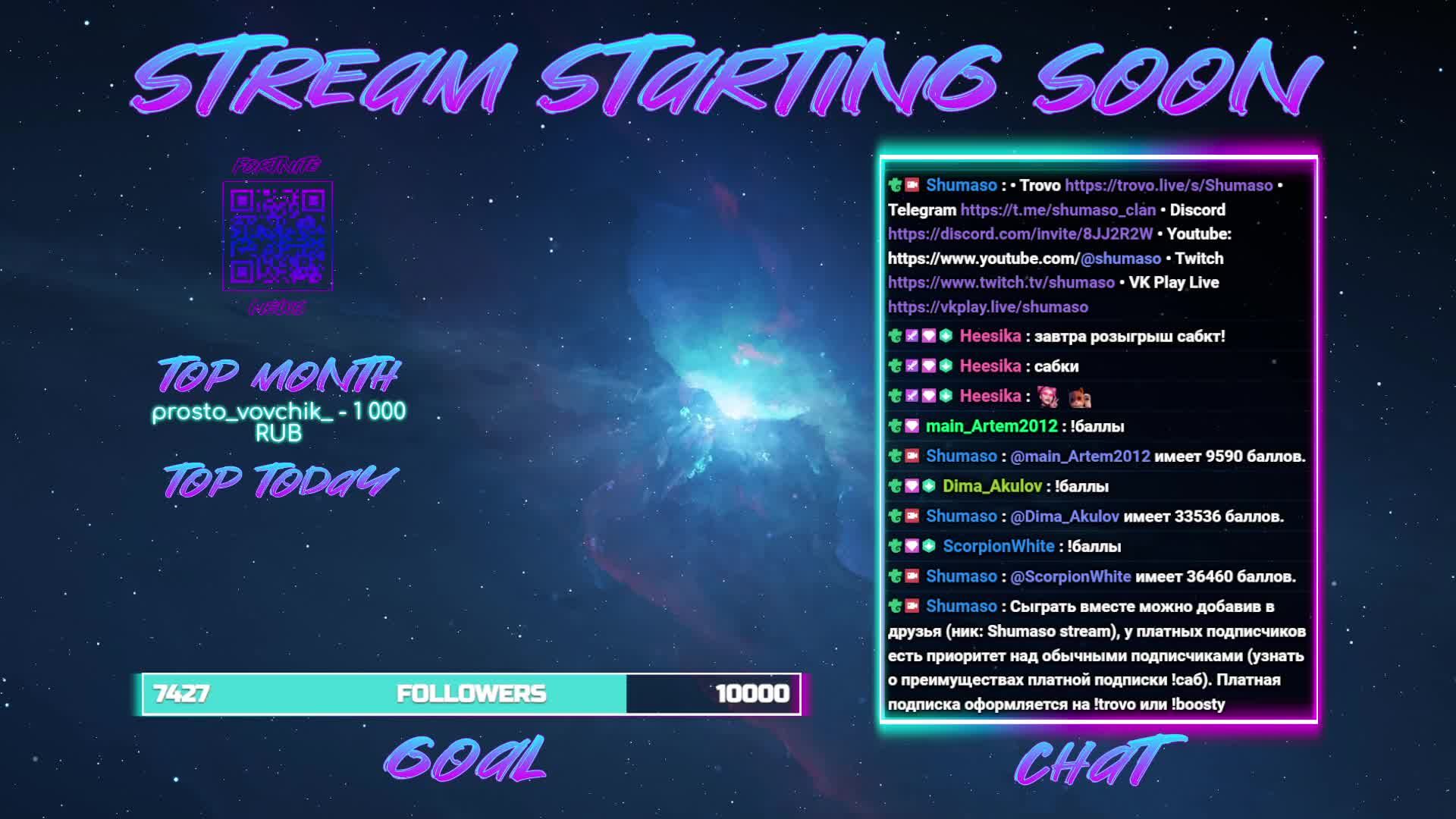Здравствуй, дорогой зритель, меня зовут Евгений! Спасибо, что заглянул на мой канал. Стримы проводятся каждый день, буду рад любой активности! Играем в Fortnite в режиме «Нулевая Высота». Огромное спасибо за вашу поддержку, она очень мотивирует и помогает делать то, что мне действительно по душе. Telegram: https://t.me/shumaso_clan Fortnite новости: https://t.me/allbefortnite Trovo: https://trovo.live/s/Shumaso Twitch: https://www.twitch.tv/shumaso Youtube: https://www.youtube.com/@shumaso VK Play: https://vkplay.live/shumaso Поддержка: https://www.donationalerts.com/r/shumaso