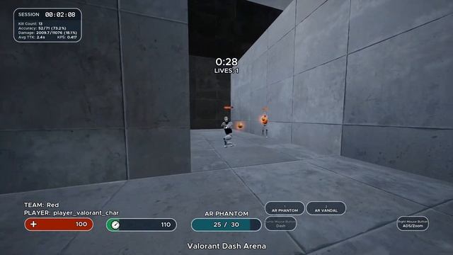 Use Ability 1 [DASH] (Max charge: 3, reset when you kill an enemy) to Scenario to kill a human-shaped BOT (HP: 150). Weapons are like Valorant's AR (killing enemies resets the number of bullets). [weapon1: PHANTOM, weapon2: VANDAL] You may use whichever you like. However, the distance is attenuated with PHANTOM. Time limit is 60 seconds. The game ends when you get hit by a BOT 3 times. (1hit: -50 points) Search by "NFNT"