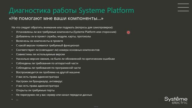 Из этого подробного видео Вы узнаете: Какие существуют инструменты для диагностики работы Systeme Platform и на какие вопросы следует ответить, если предлагаемые инструменты не помогают в вашем конкретном случае. Рассказывает Константин Воскресенский. Узнайте больше о Systeme Electric: ► Сайт: https://systeme.ru/ ► VK: https://vk.com/systemeelectric ► Telegram: https://t.me/systemeelectric_official ► Одноклассники: https://ok.ru/group/70000000047930