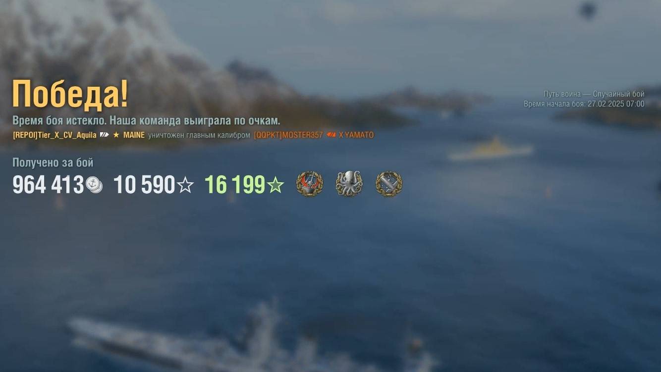 Супер линкор Maine. Игрок: Tier_X_CV_Aquila (ASIA). Карта: Путь воина - Случайный бой. Урон: 405к. Maine - Супер линкор США.