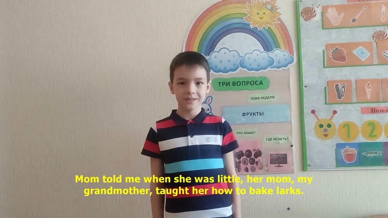 Международный конкурс «Расскажи миру о своей Родине» — проект по патриотическому воспитанию детей и молодёжи и формированию дружественных международных связей между подрастающими поколениями разных стран. «Когда я узнал о конкурсе, мне захотелось в нём поучаствовать. Я захотел рассказать о традиции в моей семье. Мне очень нравится, когда мы все вместе делаем тесто и печём жаворонков. Я захотел, чтобы о традиции моей семьи узнали ребята не только моей группы в детском саду, но и ребята в других странах».