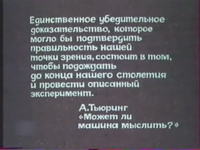 Центрнаучфильм. 1977 г. Режиссёр - Семен Райтбурт. Философская притча в формате научно-популярного фильма на тему “может ли машина мыслить”. Действие происходит в недалёком будущем — в конце 2000 года.