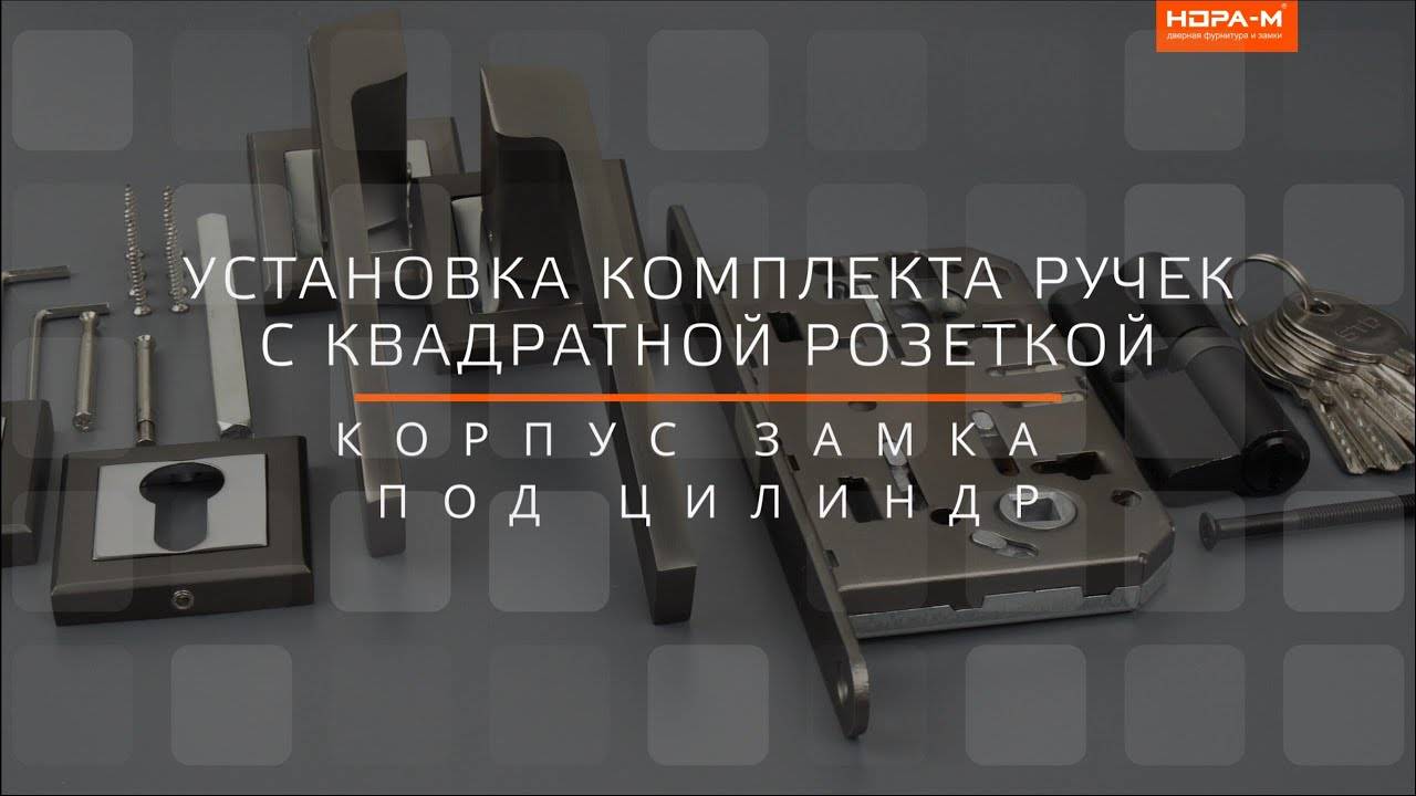 Установка комплекта ручек с квадратной розеткой и корпуса замка под цилиндр