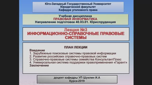 Шуклин И.А. Лекция №3 «Информационно-справочные правовые системы»