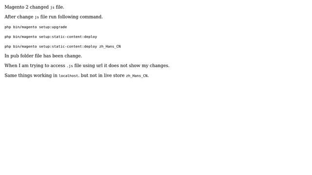 Magento: Magento 2 pub js file not change Helpful? Please support me on Patreon: https://www.patreon.com/roelvandepaar With thanks & praise to God, and with thanks to the many people who have made this project possible! | Content (except music & images) licensed under CC BY-SA https://meta.stackexchange.com/help/licensing | Music: https://www.bensound.com/licensing | Images: https://stocksnap.io/license & others | With thanks to user Suresh Chikani (magento.stackexchange.com/users/31609), user Rizwan Khan (magento.stackexchange.com/users/51548), user Hardik Visa (magento.stackexchange.com/users/24801), and the Stack Exchange Network (magento.stackexchange.com/questions/191863). Trademarks are property of their respective owners. Disclaimer: All information is provided "AS IS" without warranty of any kind. You are responsible for your own actions. Please contact me if anything is amiss at Roel D.OT VandePaar A.T gmail.com