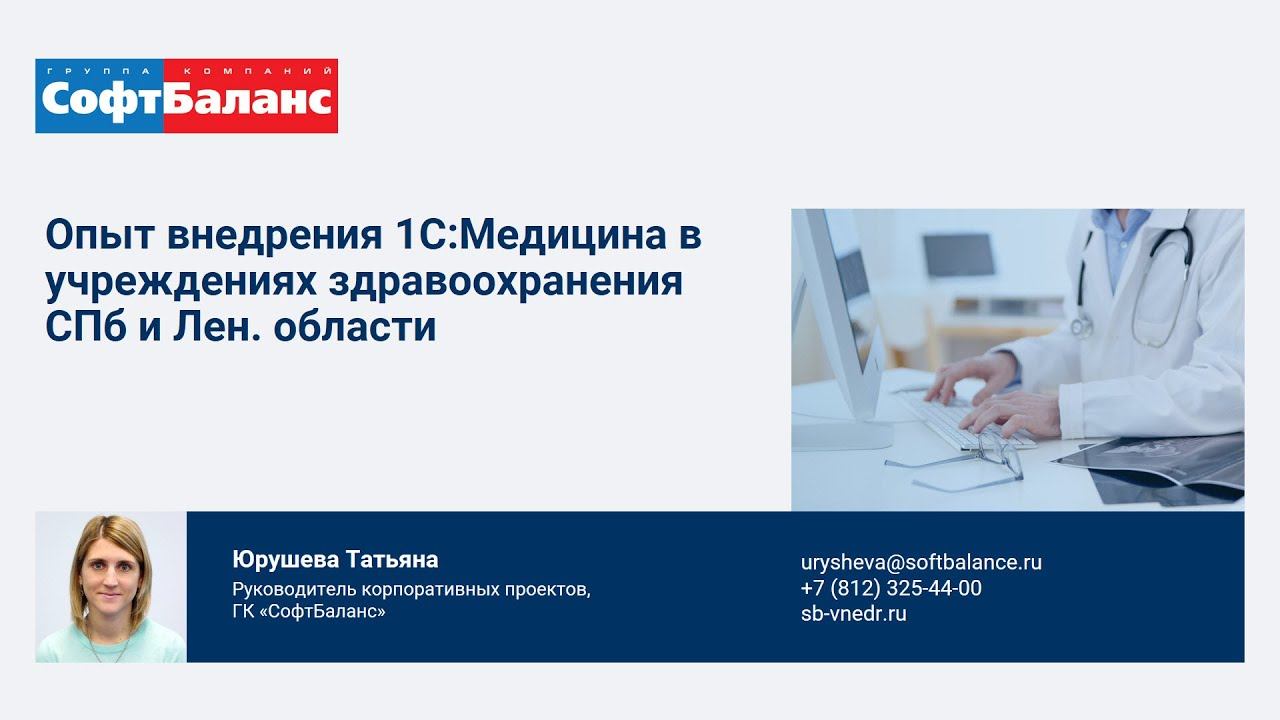 ГК "СофтБаланс" https://sb-vnedr.ru/ Опыт внедрения программных продуктов 1С:Медицина в учреждениях здравоохранения Санкт-Петербурга и Ленинградской области Докладчик: Юрушева Татьяна Александровна руководитель корпоративных проектов ГК «СофтБаланс» Опыт внедрения МИС, задачи и результаты, отзывы: https://sb-vnedr.ru/introduced_projects/33/ Описание возможностей программ 1С:Медицина: https://sb-vnedr.ru/programm/1c-medicina/ https://youtu.be/PfYO-DPkjIU