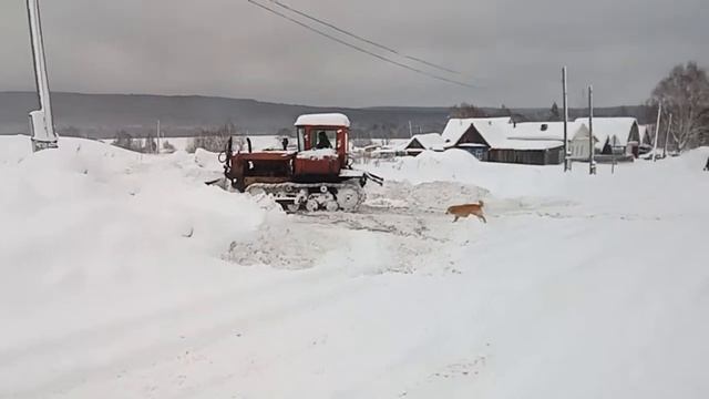 Советский бульдозер, чистит снег в селе Нижний Шкафт.