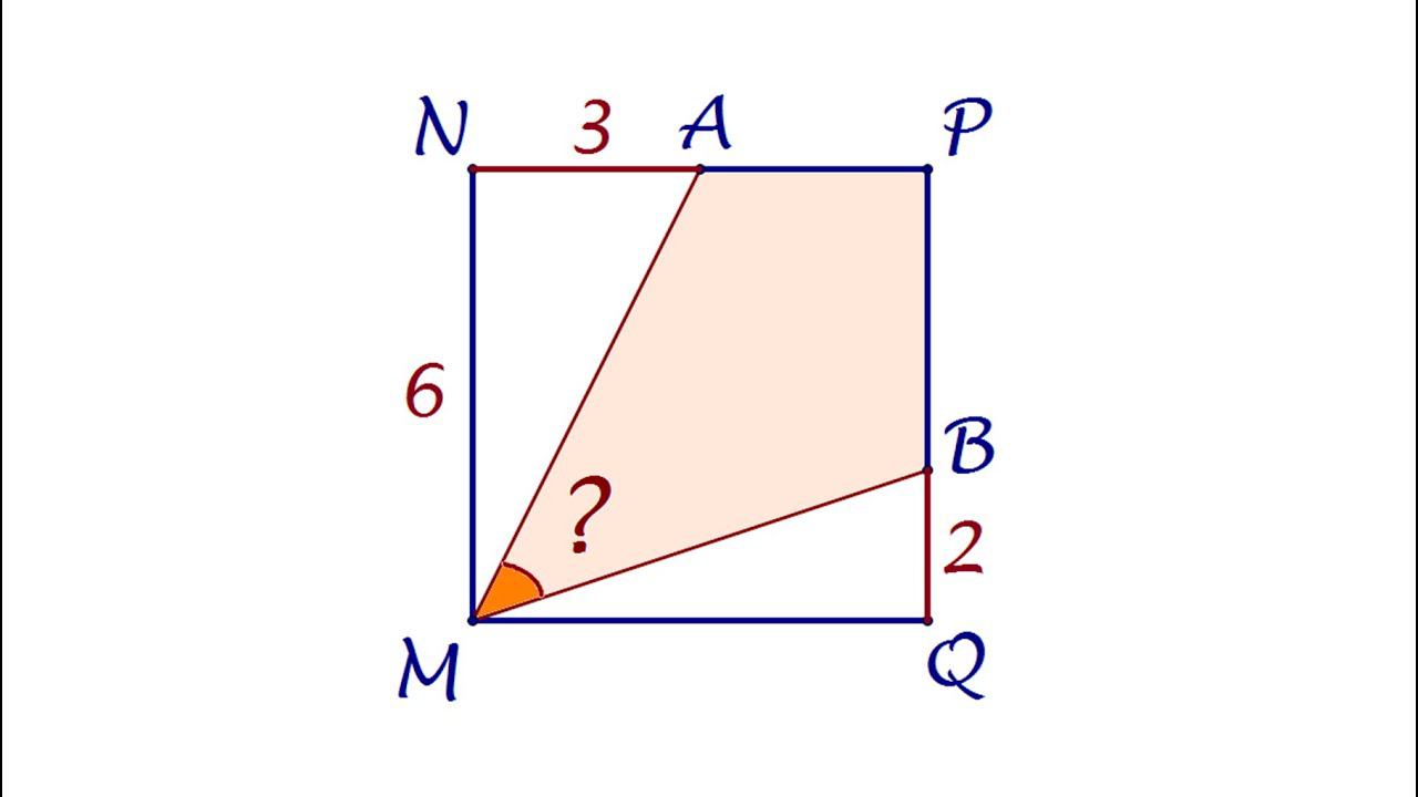 https://t.me/volkov_telegram На сторонах квадрата MNPQ взяты точки A и B так, что NA=3, QB=2. Найдите угол ∠AMB, если сторона квадрата равна 6. Мой Дзен: https://zen.yandex.ru/valeryvolkov Группа ВК: https://vk.com/volkovvalery Поддержать: http://donationalerts.ru/r/valeryvolkov Предыдущее видео: https://youtu.be/HXg5VUyR-NY Valery Volkov https://www.youtube.com/valeryvolkov Семейный Дзен: https://zen.yandex.ru/rinaval @arinablog наш семейный канал https://www.youtube.com/channel/UCktJn2SW0NzKaLkdfsYqnrg Instagram: https://www.instagram.com/volkovege/ Twitter: https://twitter.com/volkovege Почта: uroki64@mail.ru