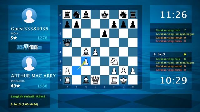 Video ini dihasilkan dari aplikasi mobile ChessFriends.com. **** Apakah anda menyukai videonya? Anda juga dapat membuat video seperti ini! Silahkan install aplikasi kami, bermain game dan kirim langsung ke YouTube. Android: https://play.google.com/store/apps/details?id=chessfriends.online.chess iOS: https://itunes.apple.com/app/chess-online-+/id903978215?mt=8 Windows 8/10: http://apps.microsoft.com/windows/app/ajedrez-online/362ae1c9-5d6f-4824-a9e7-1095b2a95e10 OSX: https://itunes.apple.com/app/chess-online-+/id919607238?l=en&mt=12 Web mobile: http://www.chessfriends.com/mobile?lang=id_ID Facebook App: https://apps.facebook.com/chessfriendscom Windows Phone: http://apps.microsoft.com/windows/app/ajedrez-online/362ae1c9-5d6f-4824-a9e7-1095b2a95e10 **** Chess Age: Android: https://play.google.com/store/apps/details?id=chess.friends.game.play IOS: https://itunes.apple.com/us/app/chess-age/id1217007613?mt=8 Facebook: https://apps.facebook.com/chessage **** Subscribe ChessFriends.com di YouTube: https://www.youtube.com/subscription_center?add_user=ChessFriendsDotCom Facebook: https://www.facebook.com/ChessFriendscom-127961610576613/?fref=ts **** Game PGN: [Event "free game"] [Site "www.chessfriends.com"] [Date "2019/7/26"] [Round "none"] [White "ARTHUR MAC ARRY"] [Black "Guest33384936"] [Result "1-0"] [ECO "D21"] [Opening "Rosenthal Variation, QGA"] [WhiteElo "1988"] [BlackElo "1278"] [WhiteCountry "ID"] [BlackCountry "IN"] [TimeControl "720000"] 1. d4 d5 2. c4 dxc4 3. Nf3 e6 4. e3 c5 5. Bxc4 cxd4 6. exd4 Qa5+ 7. Nc3 Bb4 8. O-O Bxc3 9. bxc3 Qxc3 10. Bd2 Qxc4 11. Rc1 Qxa2 12. Rxc8+ Ke7 13. Bb4+ Kd7 14. Qc1 Na6 15. Ne5# 1-0