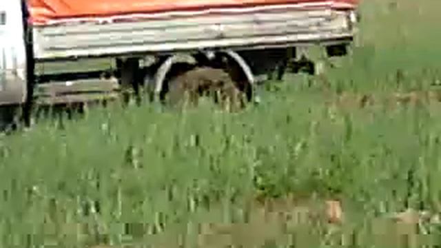 умелый тракторист вытаскивает газель на цепях