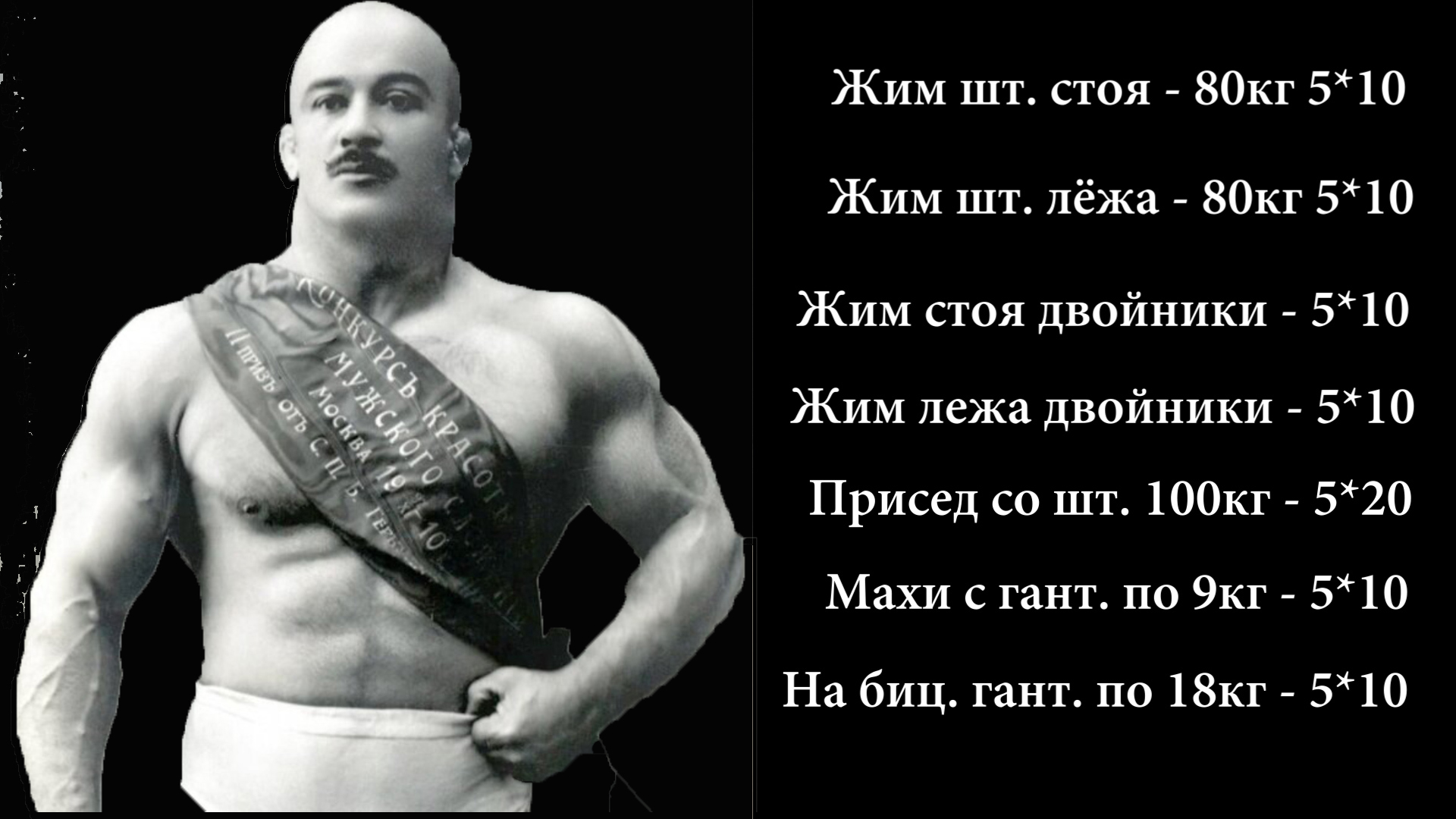 Этому интервью 110 лет ! Здравствуйте друзья! 110 лет назад не было искусственного тестостерона но Крылов в молодости тренировался 6 раз в неделю по системе Фудлбади. По мимо этого тренинг по борьбе. Как он успевал восстанавливаться и наращивать силу и массу? Загадка. Но факт на лицо. Большинство рекордов Крылова не побито до сих пор. К примеру, он выжимал 2х пудовую гирю над головой левой рукой в "солдатской стойке" 86 раз. Без отклонения корпуса. Были и чисто силовые рекорды. К примеру он выжимал на борцовском мосту штангу 134 кг. Вот его Интервью за 1914 год касаемо тренировок и распорядка дня: "Тренируюсь тяжелыми гирями: выжимаю или толкаю (через день) штангу в 5 пудов, стоя и лежа, по 50 раз (пять раз по 10 выжиманий). Выжимаю двойники 50 раз (та же пропорция). Приседаю с пятипудовой штангой - на всей стопе -100 раз, а затем хожу с тяжелым человеком на шее взад и вперед по лестнице. Кончаю тренировку гантельными движениями, причем делаю плечевые упражнения с 20 фунтовыми гантелями, а для бицепсов тяну каждой рукой по 2 таких гантели вместе. Последние два года тренируюсь тяжестями после обеда только 3 раза в неделю (прежде ежедневно), а остальные дни этот час тренируюсь борьбой в стойке и закладыванием нельсонов - необходимо мне, как борцу. После тренировки - беру душ и иду гулять". Исходя из этого можно сделать такой вот вывод, более современным языком: 1. Жим штанги стоя 80кг 5×10 2. Жим штанги лёжа 80кг 5×10 3. Жим стоя с двойниками 5×10 4. Жим лёжа с двойниками 5×10 5. Приседания со штангой 100кг 5×20 6. Махи с гантелями по 9кг стоя 5×10 7. Подъем гантелей по 18кг на бицепсы 5×10 Цитата: "Когда я тренировался «на рекорды», то брал всегда «на разы» очень небольшой вес: двумя руками - 4,5 пуда, одной рукой - 3 пуда. Тяжелый же вес брал только один раз в неделю, и тогда пробовал сделать рекорд. И вот этой своей крайне осторожной и выдержанной системе тренинга я обязан тем, что сохранил силу и мускулатуру, хотя мне приходилось, как цирковому атлету прежнего времени, иногда «работать» по несколько раз в день на представлениях очень тяжелым весом и проделывать самые трудные трюки". Как мы видим Петр интуитивно пришел к тому что надо работать с небольшими весами для отдыха ЦНС, и только раз в неделю он пробовал поставить новый рекорд на одно повторение с большим весом. Касаемо приседаний с весом в центнер, скорее всего пропорция шла именно в таком виде 5*20, ибо присесть 100кг сотню раз в одном подходе не то что бы невозможно, но не вполне практично. Как мы видим здесь не хватает становой тяги для проработки спины и скручиваний на пресс. Но учитывая то что он много приседал и боролся эти мышцы очень сильно были задействованы. Трицепсы же очень серьезно развивались под воздействием большого количества жимов стоя и лёжа. В особенности длинная головка. Что касается питания то в своих мемуарах Пётр писал что в молодости он очень много потреблял пищи. Буквально ел всё подряд. В больших количествах мясо, молоко, каши и овощи. Ну а в зрелом возрасте мясо есть перестал. Несмотря на это в 45 лет он обладал отлично развитой мускулатурой и силой. Видимо это было результатом его тренировок и питания в молодости. Образовался так называемый запас силы. Так же важную роль сыграла генетика и повышенный уровень пригодного тестостерона. Музыка Final Boss Myuu Final Boss