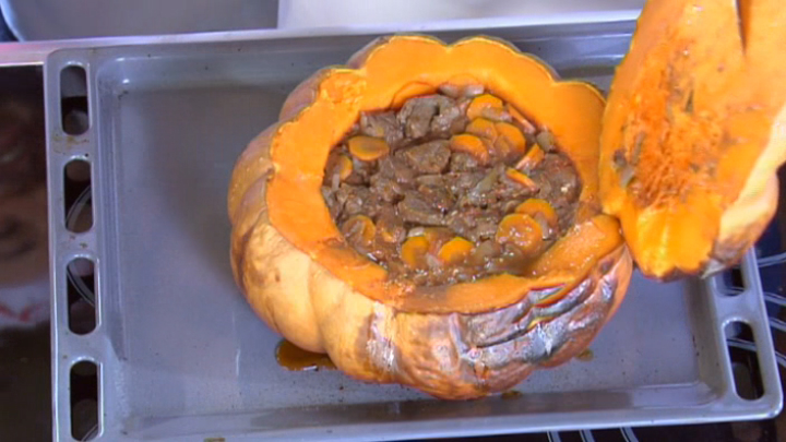На открытой кухне сегодня Хэллоуин! Вместе с развеселой компанией Альбина и Кристина приготовят самое необычное рагу – прямо в тыкве, а также сделают невероятно красивые глазированные яблоки и витаминный морс из свежей клюквы!