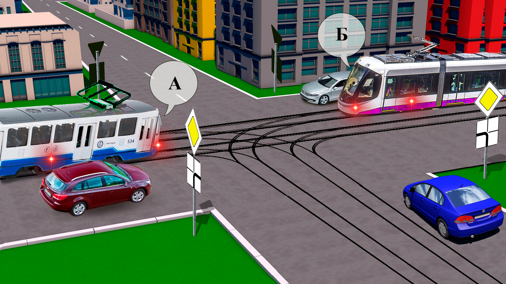 Не всегда водители автомобилей обязаны уступать дорогу трамваю. Трамвай тоже подчиняется требованию знаков приоритета. Решите эту задачу сами и поделитесь задачей с друзьями. Возможно, им тоже будет интересно?