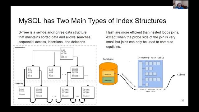 Dave Stokes, MySQL Community Manager at Oracle, delivered the talk "An Introduction to MySQL Indexes and Histograms" at Open Source 101 on Tuesday, March 30, 2021. Abstract: Nobody ever complains that the database is too fast. But tuning a database query can get tricky. You add one index and things go faster but adding a second one makes processing crawl. The MySQL optimizer uses historical information to develop a query plan and the two best known ways to augment that information are indexes and histograms. This session covers how indexes really work, how the optimizer evaluates those indices for processing, how secondary indexes piggy-back’ on primary indexes, and how to tell what index is really being used. And new in 8.0 are histograms but they may not fit your data. So if you want faster queries or just a better understanding of how MySQL works then this session is for you. Find Dave on the internets: Twitter: https://twitter.com/stoker Personal website: https://elephantdolphin.blogspot.com/