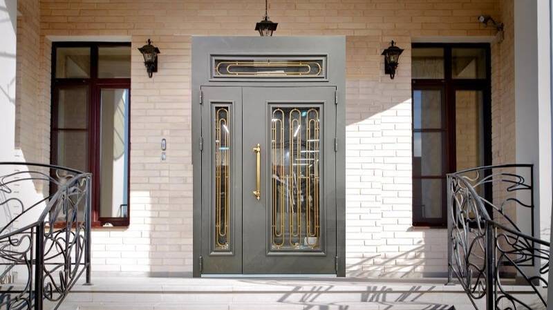 Уличная входная металлическая дверь двустворчатая, со стеклом, защитной решеткой, терморазрыв, в дом