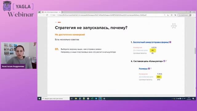 Тема: "Как закрыть KPI в нише пластиковых окон с помощью Яндекс.Директ" Анастасия Андронова — руководитель отдела маркетинга агентства «Вебпрактик». Спикер отраслевых региональных конференций. Преподавала в Южной школе интернет-бизнеса. В программе: 1. Оптимизация конверсий; 2. Как переход на автоматические стратегии Яндекс.Директ помогли закрыть KPI по лидам; 3. Ошибки, которые встретились на пути настройки. ✅ Записаться на курс по эффективному привлечению клиентов из Яндекс.Директ с использованием метода гиперсегментации: https://institute.yagla.ru/direct Повышайте отдачу от контекстной рекламы с помощью сервиса Yagla -﹥ https://yagla.ru/ Добавляйтесь в наши социальные сети: VK -﹥ https://vk.com/multilanding YouTube -﹥ https://www.youtube.com/c/YaglaRuOnline Telegram -﹥ https://t.me/yagla