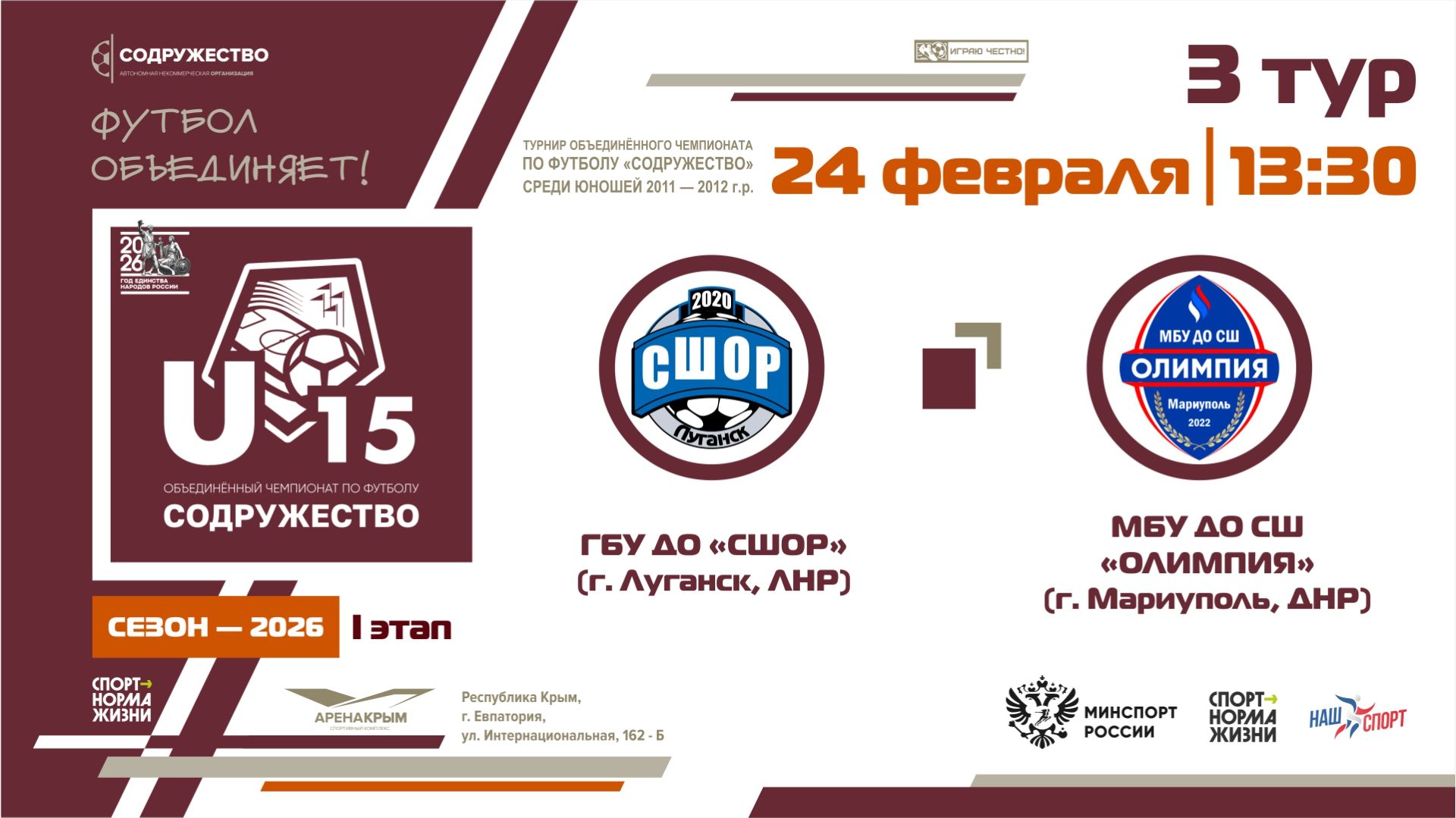 3 ТУР | U-15 | ГБУ ДО «СШОР» (г. Луганск, ЛНР) - МБУ ДО СШ «Олимпия» (г. Мариуполь, ДНР) | 24.02.2026 | 13:30