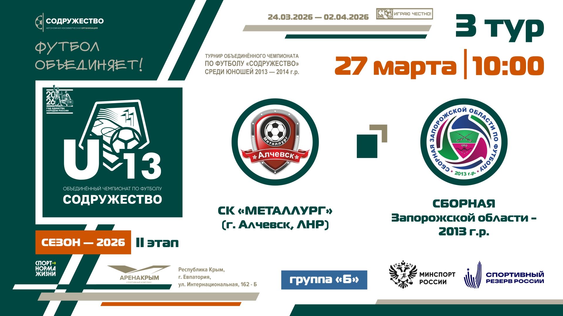3 ТУР [Группа Б] | СК "Металлург" (г. Алчевск, ЛНР) - Сборная Запорожской области 2013 | 27.03.2026