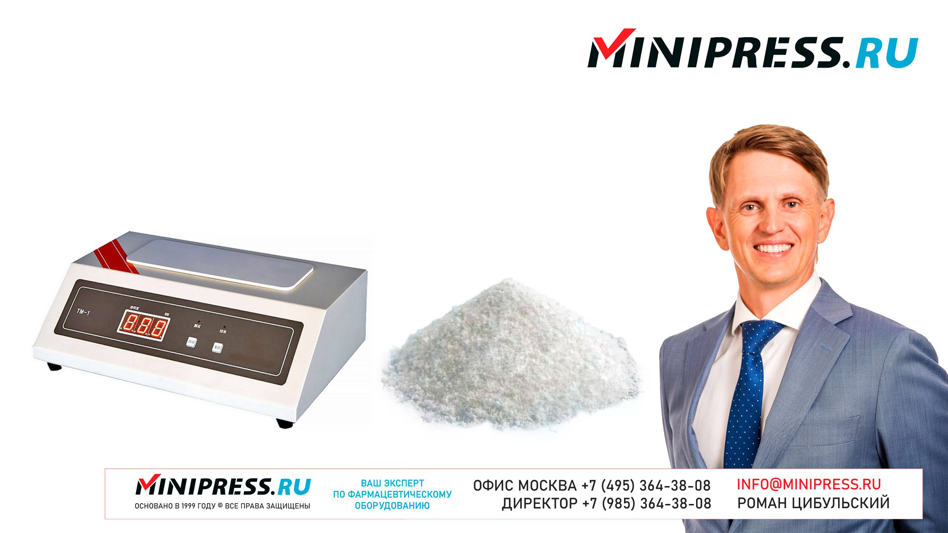 Лабораторный анализатор прозрачности желатина TM-01 https://Minipress.ru/katalog/ Фармацевтическое оборудование. Специалисты в фармацевтическом оборудовании и технологиях производства лекарств. Более 20 лет оказываем нашим клиентам помощь в выборе, поставке, наладке различного фармацевтического оборудования! Вы в поиске надежного поставщика оборудования? Мы предоставим вам лучший сервис 24/7. Собрана лучшая команда профессионалов в фармацевтической отрасли и налажены стабильные связи с лучшими производителями. Мы не только продаем, но и производим многие модели оборудования Директор компании Минипресс Роман Цибульский Поставка фармацевтического оборудования в Россию Пишите: info@minipress.ru Телефон +7(495)364-38-08; Мобильный +375(29)308-00-00 Россия, Москва Skype: RomanTsibulsky; ICQ: 310-134-490 Подписывайтесь на наш видео канал на Youtube https://youtube.com/user/wwwMinipressru Обновленный сайт https://Minipress.ru Каталог оборудования https://Minipress.ru/katalog/ МЫ В СОЦИАЛЬНЫХ СЕТЯХ G+ https://plus.google.com/+RomanTsibulsky/ FB https://facebook.com/roman.tsibulsky YOUTUBE https://youtube.com/user/wwwMinipressru IN https://ru.linkedin.com/pub/roman-tsibulsky/a6/933/661 БОЛЬШОЙ КАТАЛОГ ФАРМАЦЕВТИЧЕСКОГО ОБОРУДОВАНИЯ https://minipress.ru/katalog/ Постоянно обновляемый каталог различного фармацевтического оборудования с фотографиями, описаниями, видео и ценами. ПЕРСОНАЛЬНЫЙ МЕНЕДЖЕР 24 ЧАСА https://minipress.ru/katalog/ Вы общаетесь по всем вопросам, с момента первой консультации и до получения оборудования, с одним специалистом. СПЕЦИАЛИСТЫ И ТЕХНОЛОГИ https://minipress.ru/katalog/ Имеем обширные связи в фармацевтической среде, найдем любого специалиста, поможем с освоением оборудования и технологий. ОБСУЖДЕНИЕ ВАШИХ ИДЕЙ ПО ПРОИЗВОДСТВУ ПРОДУКЦИИ https://minipress.ru/katalog/ Поможем в оценке ваших идей. Большой опыт в организации различных производств и выпуске продукции. Ценные советы. ФАРМАЦЕВТИЧЕСКОЕ ОБОРУДОВАНИЕ Мы поставили перед собой задачу, помогать нашим клиентам в правильном выборе фармацевтического оборудования. Многолетний опыт подобной деятельности показывает, что многие клиенты сталкиваются, в первую очередь, с непониманием технологического процесса. Покупка оборудования должна быть финальной точкой после подробного обсуждения задачи, консультацией с производителем оборудования, отправкой сырья и материалов на фабрику, тестирования в работе. ДЛЯ ТАБЛЕТОК https://minipress.ru/katalog/category/farmacevticheskoe_oborudovanie/ Смешивание порошков, гранулирование, прессование, обеспыливание, покрытие оболочками, фасовка, упаковка, счет, нанесение логотипов ДЛЯ ЖЕЛАТИНОВЫХ КАПСУЛ https://minipress.ru/katalog/category/farmacevticheskoe_oborudovanie/kapsulyatory-dlya-tverdyh-zhelatinovyh-kapsul/ Фасовка порошков и масел, обеспыливание, счет и фасовка, упаковка, нанесение логотипов. ФАСОВКА И УПАКОВКА https://minipress.ru/katalog/category/upakovochnoe_oborudovanie/ Упаковка в пластиковые и стеклянные флаконы, блистер, фольгу, ламинированную бумагу, стеклянные ампулы, саше, стрипы, тубы, тюбики, контурную ячейку. ТЕХНОЛОГИЧЕСКОЕ https://minipress.ru/katalog/category/eksperimentalnoe-oborudovanie/ Лабораторное, аналитическое, подготовительное, отдельные машины и линии под ключ. СФЕРЫ ДЕЯТЕЛЬНОСТИ Наша компания занимается множеством направлений фармацевтического бизнеса! Предлагаем Вам посетить страницы нашего сайта https://www.Minipress.ru по различным специализациям. ОБОРУДОВАНИЕ ДЛЯ НАКЛЕЙКИ ЭТИКЕТОК НА БУТЫЛКИ АМПУЛЫ ФЛАКОНЫ https://minipress.ru/katalog/oborudovanie-s-otzyvami/oborudovanie-dlya-naklejki-etiketok-na-butylki-ampuly-flakony/ Автоматическое этикетировочное оборудование для этикеток на клеевой основ