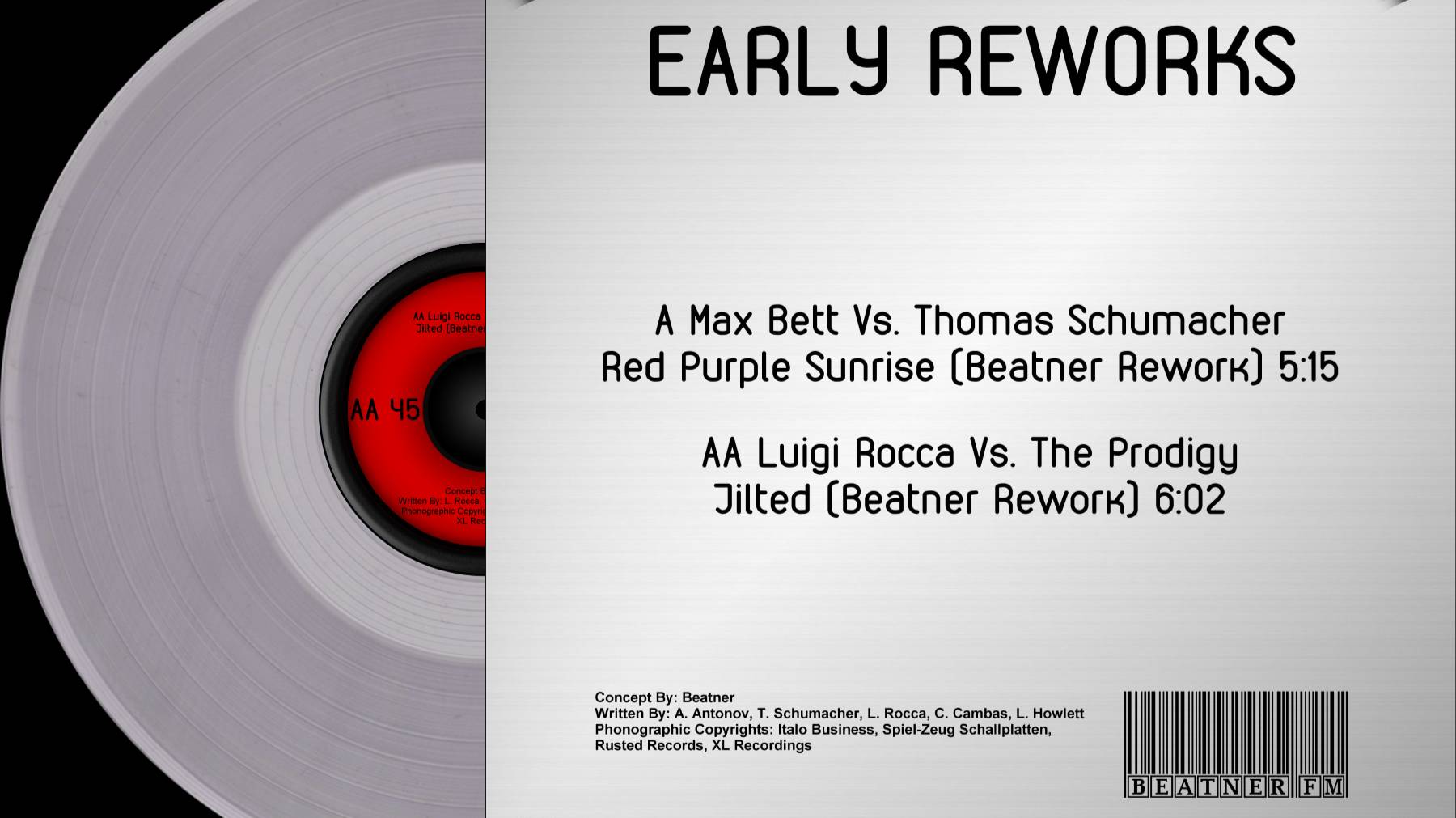 Beatner - Early Reworks (Side AA) Label: Beatner FM Format: Vinyl, 12", EP, 45 RPM, Stereo, Clear Country: Russia Release: Mar 9, 2026 Genre: Electronic Style: Techno, Minimal AA Luigi Rocca Vs. The Prodigy - Jilted (Beatner Rework)
