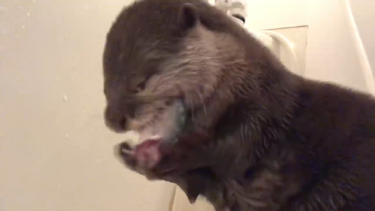 Выдра с радостным визгом трапезничает рыбой в ванной. #выдра #рыба #кушает #визжит
