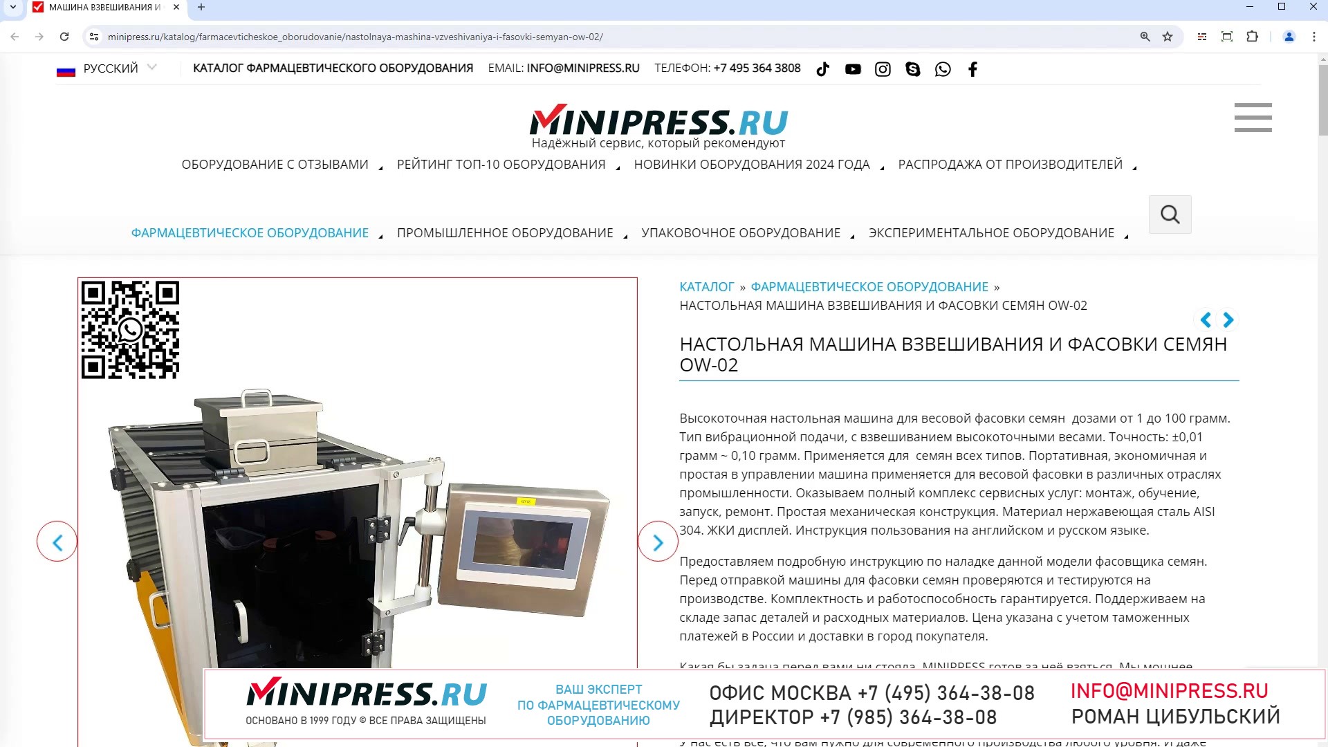 Компания MINIPRESS.RU имеет большой опыт работы с различными БЛИСТЕРНЫМИ МАШИНАМИ. Мы знаем как упаковать в блистеры желатиновые капсулы, таблетки, шприцы, зубные щетки, стеклянные ампулы, мед, сливочное масло и сливки. Блистирование, блистерные машины, блистерное оборудование, производство блистеров их ПВХ и алюминиевой фольги это основная сфера нашей деятельности. Компания Романа Цибульского MINIPRESS.RU занимается поставкой большого ассортимента фармацевтического оборудования из Китая, Кореи, Индии, Европы и других стран. Мы выполняем работы по поиску, подбору, закупке, доставке, и таможенной очистке оборудования с доставкой в любой город России и стран СНГ. Основатель и ведущий специалист компании - Роман Цибульский. Компания MINIPRESS.RU (зарегистрированный товарный знак) основана в 2000 году. Онлайн каталог оборудования MINIPRESS.RU ежедневно посещают несколько тысяч человек. Мы развиваем крупные каналы в социальных сетях, посвященные тематике фармацевтического оборудования. Вы можете посмотреть видео ролики об оборудовании, которым мы занимаемся. Фактически у нас самый большой в России многоязычный каталог фармацевтического оборудования с фотографиями, описаниями, и что более важно с ценами и видео демонстрацией оборудования в работе. Подбор оборудования и консультации ведет сам владелец компании - Роман Цибульский. Компания имеет огромный опыт в работе с различным оборудованием, технологиями. Помогаем клиентам выбрать модель фармацевтического оборудования, которое сможет решить поставленную задачу. Наши специалисты помогают рекомендациями в решении проблем по эксплуатации оборудования. Наша компания имеет офис в г.Шанхай и несколько менеджеров, которые помогают в работе с китайскими поставщиками. Мы долго сотрудничаем и дружим с этими специалистами. Китайские поставщики ценят нас как постоянных партнеров. Роман Цибульский Директор компании Минипресс Поставка фармацевтического оборудования в Россию Пишите: info@minipress.ru Gmail: boss.minipress@gmail.com Офис в Москве +7(495)364-38-08 Мобильный +7(985)364-38-08 (WhatsApp) Каталог оборудования https://www.Minipress.ru/katalog/ МИНИПРЕСС.РУ В СОЦИАЛЬНЫХ СЕТЯХ FB https://facebook.com/roman.tsibulsky YOUTUBE https://www.youtube.com/@farmacevticheskoe_oborudovanie INSTAGRAM https://www.instagram.com/farmacevticheskoe_oborudovanie/ #ампулы #сортировка #датер #упаковка #капсулы #финансы #смеситель #насос #производство #мазь