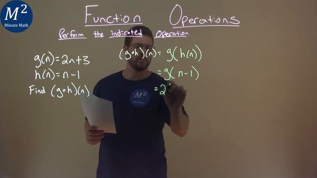 Function Operations. We learn how to find (g o h)(n) for g(n)=2n+3 and h(n)=n-1. We learn how to perform the indicated operation to find (g o h)(n) for g(n)=2n+3 and h(n)=n-1. This is a great introduction into function operations and how to perform indicated operations. This is under the topic of General Functions with this free online math video lesson. #functions #functionoperations #onlinemathlessons #minutemath #algebra2 Every Month we have a new GIVEAWAY that is FREE to Enter. See link below for details. You can enter Every Month! https://www.minutemathtutor.com/current-giveaway Subscribe to our YouTube Channel: https://www.youtube.com/user/MinuteMath?sub_confirmation=1 Visit our website for links to all of our videos: https://www.MinuteMathTutor.com Need a Math Tutor? https://www.minutemathtutor.com/tutor Visit our STEM Store for all your Math and Science Gear: https://minutemathshop.com/ Great Educational Resources Here: https://www.minutemathtutor.com/resources Nominate a Great Teacher Here: https://www.minutemathtutor.com/nominate-your-teacher Have a Math Lesson you would like to add to our community of videos? Click here: https://www.minutemathtutor.com/video-submissions Subscribe to our other Life and Finance/Business YouTube Channel: https://www.youtube.com/channel/UCkpi6LiBAMAW0gUtRJfEL3Q?sub_confirmation=1. Consider supporting us on Patreon... https://www.patreon.com/MinuteMath Follow us for... Tweets: https://twitter.com/minutemath Instagram: https://www.instagram.com/minutemath/ Facebook: https://www.facebook.com/MinuteMath/ Instagram Shop: https://www.instagram.com/minutemathshop/ Facebook Shop: https://www.facebook.com/MinuteMathShop/ Business and Personal Instagram: https://www.instagram.com/gannonforpresident/