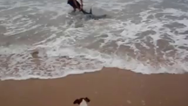 Бесстрашный парень возвращает белую акулу в море.