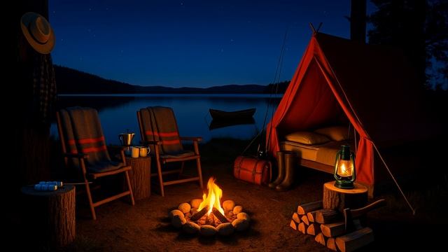 Ночной костер у озера – потрескивание огня, сверчки и ласковые волны для сна
