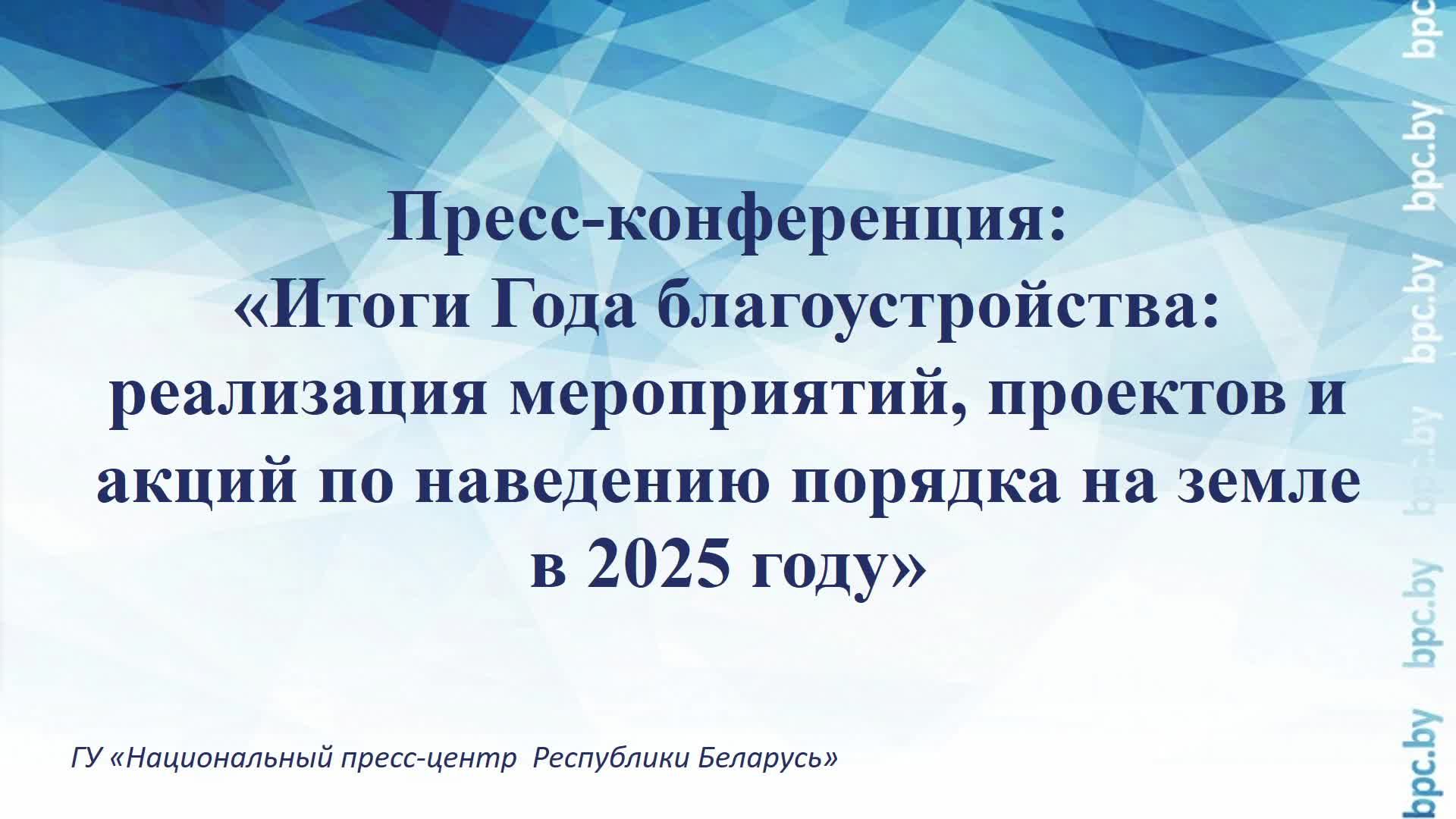 Пресс-конференция: «Итоги Года благоустройства: реализация мероприятий, проектов и акций по наведению порядка на земле в 2025 году» Стасюкевич Алексей Кириллович – заместитель Министра природных ресурсов и охраны окружающей среды; Севрук Надежда Сергеевна – заместитель начальника управления жилищного хозяйства Министерства жилищно-коммунального хозяйства; Каскевич Иван Алексеевич – заместитель начальника главного управления-начальник управления растениеводства Министерства сельского хозяйства и продовольствия; Каркозова Виктория Алексеевна – начальник отдела градостроительства управления проектной деятельности, градостроительства и архитектуры Минстройархитектуры; Корик Сергей Владимирович – Первый заместитель начальника службы пути Управления Белорусской железной дороги; Демидович Дмитрий Владимирович – начальник управления РУП «Минскавтодор-Центр». Задать вопрос: vopros@bpc.by Вся самая актуальная и оперативная информация о пресс-мероприятиях Национального пресс-центра Республики Беларусь будет публиковаться на нашем телеграм-канале. Подписывайтесь на нас: https://t.me/s/belpresscenter
