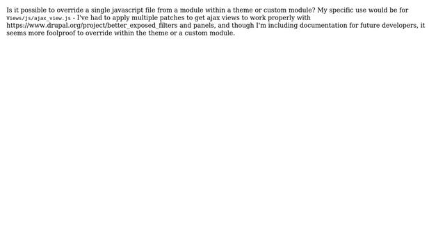 Drupal: Override module javascript file in theme or custom module Helpful? Please support me on Patreon: https://www.patreon.com/roelvandepaar With thanks & praise to God, and with thanks to the many people who have made this project possible! | Content (except music & images) licensed under CC BY-SA https://meta.stackexchange.com/help/licensing | Music: https://www.bensound.com/licensing | Images: https://stocksnap.io/license & others | With thanks to user nkanderson (drupal.stackexchange.com/users/36253), user kiamlaluno (drupal.stackexchange.com/users/199), user gapple (drupal.stackexchange.com/users/1777), and the Stack Exchange Network (drupal.stackexchange.com/questions/187986). Trademarks are property of their respective owners. Disclaimer: All information is provided "AS IS" without warranty of any kind. You are responsible for your own actions. Please contact me if anything is amiss at Roel D.OT VandePaar A.T gmail.com