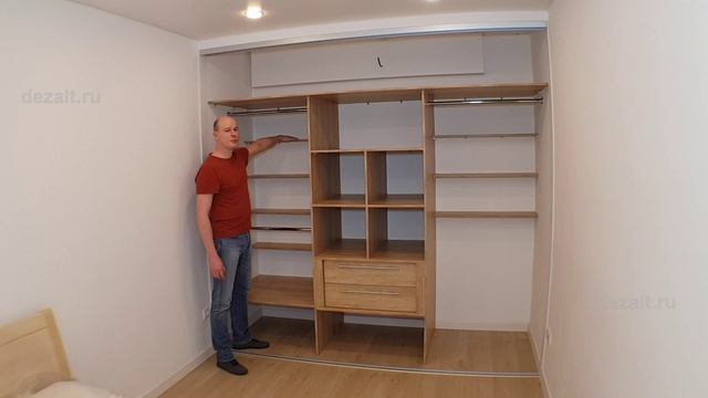 Для гардеробной пространства было мало, а для шкафа как то много... Решили сделать вот такой проверенный уже временем вариант, когда по передней части штанги, а внутри узкие полочки.
