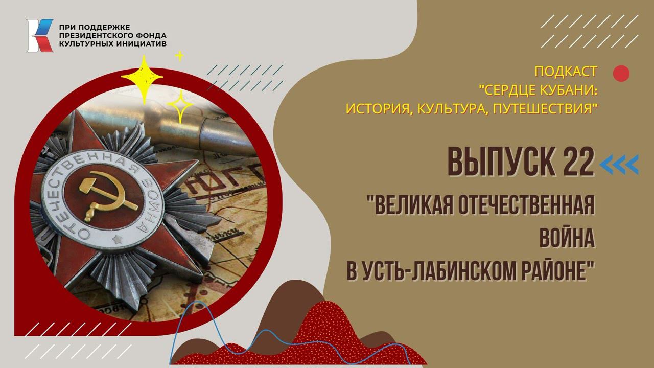 В двадцать второй серии подкаста «Сердце Кубани: история, культура, путешествия» речь пойдет о жизни Усть-Лабинского района в годы Великой Отечественной войны. Проект реализуется при поддержке Президентского фонда культурных инициатив. А если вас заинтересовала история Усть-Лабинского района, то рекомендуем следующие книги: 1. "История, этнография и фольклор Кубани (материалы Кубанской фольклорно-этнографической экспедиции). Том третий: Усть-Лабинский район" составители: российский этнограф, кандидат исторических наук Н. И. Бондарь и кандидат исторических наук А. И. Зудин; 2. «Усть-Лабинск. Историко-краеведческие очерки 1794-2014 гг.», авторы: А. Забазнов, С. Савенко и Т. Карасёва, рецензент доктор исторических наук В.Н. Ратушняк; 3. Литературно-исторический сборник «Вспомним те горящие года», выпущенный районным Советом ветеранов под редакцией Татьяны Николаевны Игнатовой. #местосилы #вов #великаяотечетсвеннаявойна #войнанакубани