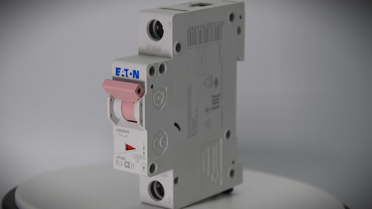 Автоматический выключатель серии серии PL7, производства EATON. Отличаются повышенной отключающей способностью 10 кА. Маркировка номинального тока выключателя своим цветом рычага. Например, в этом авт. выкл. на 2А рычаг включения розового цвета. А для 6А цвет рычага зеленый. Узнать подробнее вы можете в нашем интернет-магазине по ссылке: www.electroline.ru/product/pl7-c21-avtomaticheskiy-vyklyuchatel-2a-krivaya-otklyucheniya-c-1-polyus-otkl-sposobnost-10-ka.html