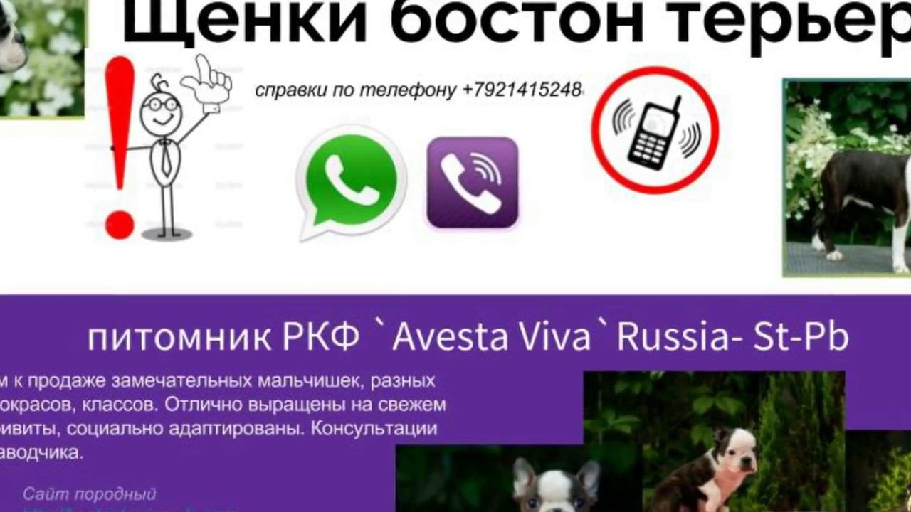 Питомник собак АВЕСТА ВИВА. Россия, Санкт-Петербург AVESTA VIVA. Бостон терьер. Россия, Санкт-Петербург Сайт БОСТОН ТЕРЬЕР в Санкт-Петербурге http://bostonterriersale.com 8 931 289-49-89, 8 921 9512488, 8 921 95124777 http://avesta-viva.ru/, http://avestaclub.ru/avestaviva/ https://www.facebook.com/avestaviva/ страница Авеста Вива https://www.facebook.com/bostonterrier.ru/ страница Бостон терьер https://www.facebook.com/bostoninstpb/ страница Бостон терьер в Петербурге https://www.facebook.com/groups/568818143139719/ группа Авеста Вива кеннел https://vk.com/public89807840 Страница БОСТОН ТЕРЬЕР лучший в мире компаньон https://vk.com/public135590088 Сообщество ВКонтакте АВЕСТА ВИВА кеннел -~-~~-~~~-~~-~- Please watch: "Кроличья гладкошерстная такса Авеста Вива Царевна Будур" https://www.youtube.com/watch?v=7yQO-hH19DU -~-~~-~~~-~~-~-