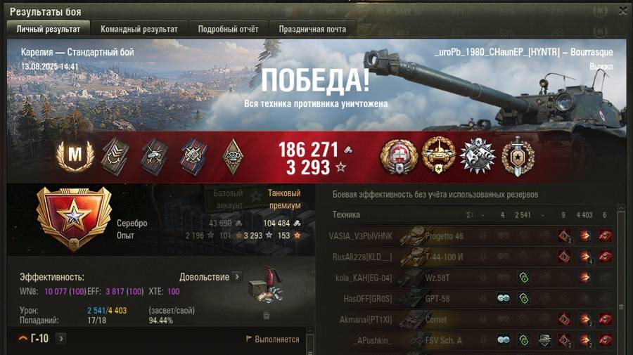КАРЕЛИЯ МАСТЕР на Bourrasque ОПЫТ: 1626 СУММАРНЫЙ УРОН: 6944 медаль СНАЙПЕР ДОЗОРНЫЙ ВОИН