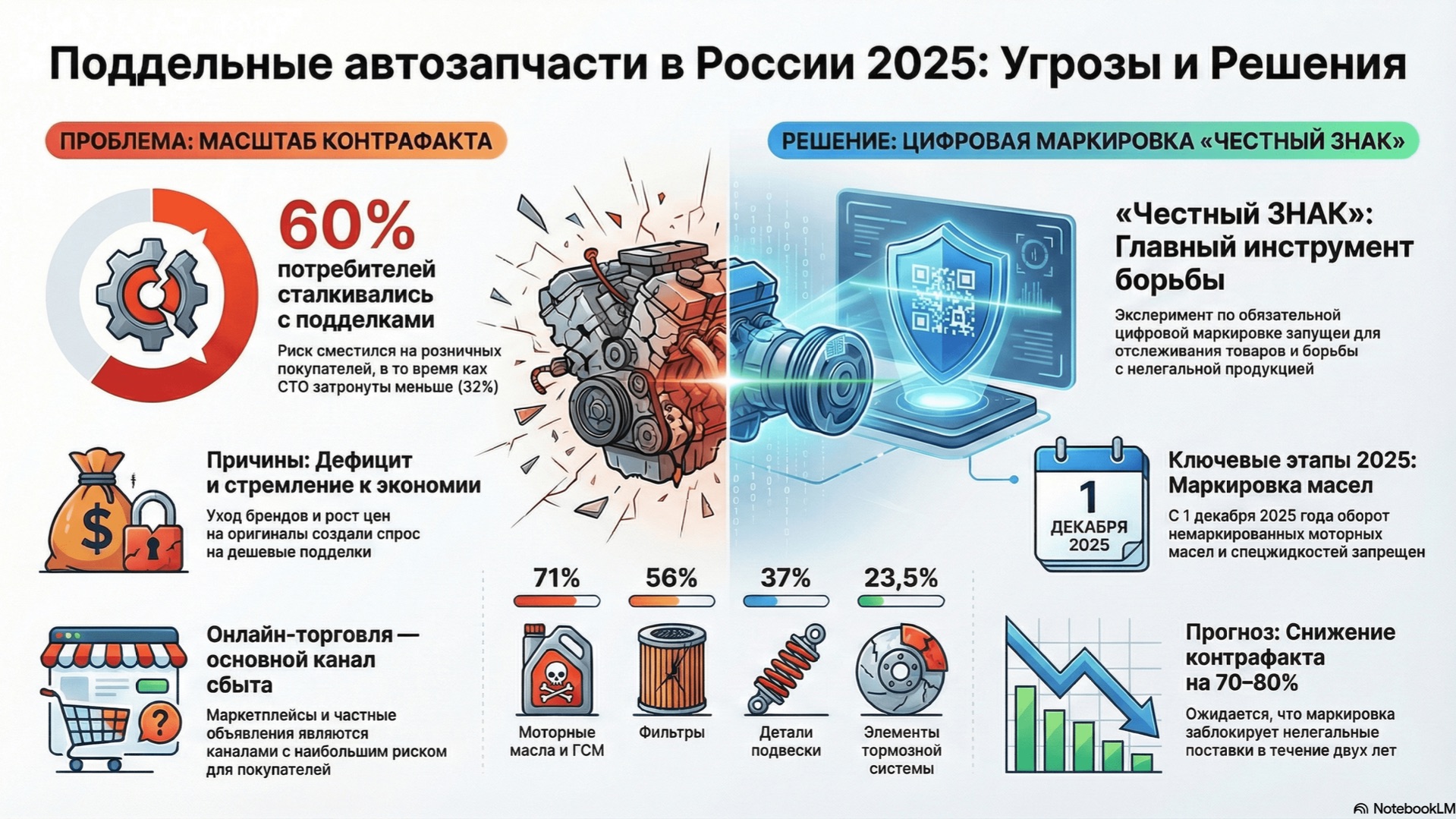 Данный аналитический обзор посвящен рынку контрафактных автозапчастей в Российской Федерации в 2025 году, отмечая его значительное проникновение, несмотря на активизацию регуляторных мер. Наблюдается существенная диспропорция: 32% профессиональных автосервисов сталкивались с подделками (снижение по сравнению с 2024 годом), тогда как 60% потребителей сообщали о столкновении с некачественными или фальсифицированными компонентами, что указывает на перенос риска в сегмент B2C. Лидерами по фальсификации остаются моторные масла и ГСМ (до 71%), за ними следуют фильтры (56%). Основными причинами распространения являются логистические разрывы, возникшие после ухода крупных иностранных брендов, создавшие дефицит предложения, а также удорожание оригинальных комплектующих. Контрафакт распространяется через неконтролируемые розничные точки, автомобильные рынки и онлайн-платформы, где отсутствуют механизмы прозрачного контроля. В 2025 году запущен эксперимент по обязательной цифровой маркировке «Честный ЗНАК» для отдельных категорий запчастей, с фокусом на ГСМ и фильтры. Прогнозируется, что внедрение маркировки сократит долю контрафакта на 70-80% в течение двух лет. Фальсификаторы также активно используют миф о «дешевом оригинале по параллельному импорту» для маскировки подделок и обмана потребителей. #КонтрафактныеАвтозапчасти #РоссийскийРынок #Автозапчасти2025 #ПроблемыСнабжения #ЦифроваяМаркировка #ЧестныйЗНАК #РискиДляПотребителей #МоторныеМасла #Фильтры #ПараллельныйИмпорт документ - https://t.me/autoanalitic подписаться - https://t.me/arxivpaperu отправить донаты: USDT: 0xAA7B976c6A9A7ccC97A3B55B7fb353b6Cc8D1ef7 BTC: bc1q8972egrt38f5ye5klv3yye0996k2jjsz2zthpr ETH: 0xAA7B976c6A9A7ccC97A3B55B7fb353b6Cc8D1ef7 SOL: DXnz1nd6oVm7evDJk25Z2wFSstEH8mcA1dzWDCVjUj9e создано с помощью NotebookLM