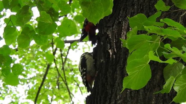 Дятел кормит своего птенца