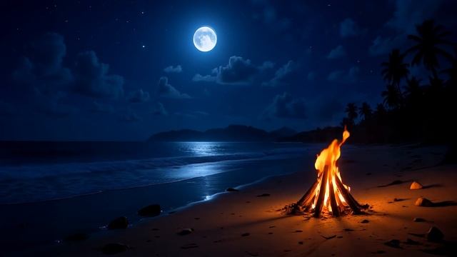 Уютный летний пляжный вечер, потрескивающий костер и океанские волны для сна и релаксации | ASMR