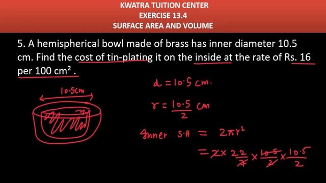 5. A hemispherical bowl made of brass has inner diameter 10.5cm. Find the cost of tin-plating it on the inside at the rate of Rs 16 per 100 cm2. (Assume π = 22/7) For Short Notes, Revision Notes And NCERT Solution. Visit Us at- https://www.kwatratuitioncenter.com/