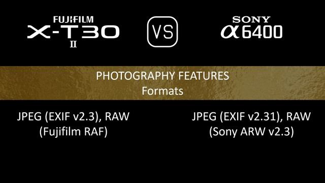 This video overviews the Fujifilm X-T30 II and the Sony A6400 in a parallel comparison of specifications. Thanks for watching. If you liked this video and found it informative, make sure to subscribe for more. 00:24 LAUNCH 00:32 BODY 00:40 SENSOR 01:05 IMAGE 01:17 OPTICS & FOCUS 01:45 SCREEN 02:02 VIEWFINDER 02:18 PHOTOGRAPHY FEATURES 03:19 VIDEOGRAPHY FEATURES 03:35 STORAGE 03:39 CONNECTIVITY 04:03 PHYSICAL 04:24 MISC