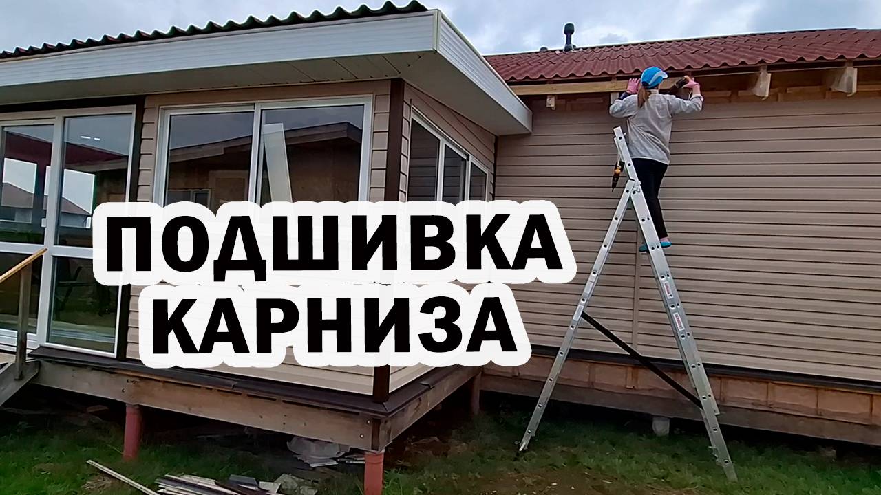 Начинаю подшивать карнизы дома. Саша обшивает веранду