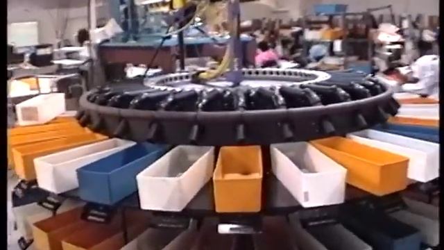 The famous Seattle FilmWorks film sorter (click "more" for additional details).. 35mm cassettes would come down a track at the top which ends above the curved yellow tube. Each roll of film had a barcode sticker which defined film type, print size, etc. The film passed under a scanner, the barcode number was looked up in a database, which determined the correct sort. The yellow curved tube would spin around to a matching tube with a tote on the other end. The film would then be dropped through the tube into a tote containing film of the same sort. Tis was the first sorter, which took a long time to debug, but it ran well it was finished. THis was replaced later by a similar unit which had more PLCs controlling it, and it took far less time to put into production. These sorters could sort thousands of rolls an hour. No video of it spinning, as the camera battery died.