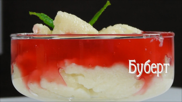 БУБЕРТ ПОД КЛЮКВЕННЫМ СОУСОМ РЕЦЕПТ Отделить желток от белка, желток соединить с сахаром и ванильным сахаром и растереть. Белок взбить в крутую пену. В горячее молоко добавить манную крупу, варить до загустения. Добавить желток и тщательно размешать. Проварить. Затем добавить взбитый белок и проварить. Остудить, разложить по порциям и залить соусом или жидким вареньем. Для соуса в клюквенном соке растворить сахар, довести до кипения и добавить крахмал растворенный в воде. Довести до кипения и проварить минуту.