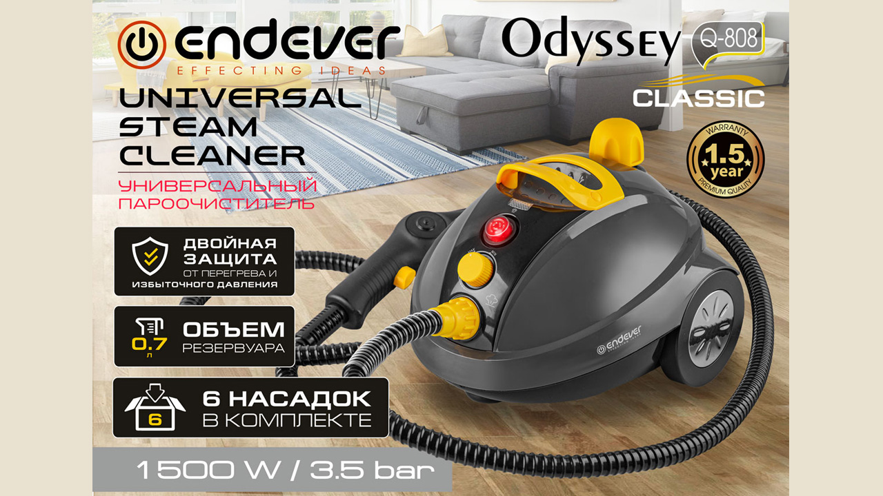 Endever Odyssey Q-808: новое слово в мире уборки и дезинфекции! Современный мир требует современных решений, и мы представляем вам новый уровень в уборке и дезинфекции с Универсальным отпаривателем-пароочистителем Endever Odyssey Q-808. Этот надежный спутник для вашего дома или офиса обеспечивает выдающуюся производительность и надежность, позволяя вам с легкостью справляться с разнообразными задачами. Продуманный дизайн: Стильный темно-серый и желтый дизайн Endever Odyssey Q-808 придает прибору современный вид. Его удобная рукоятка и легкий вес делают использование комфортным, а компактные размеры позволяют легко хранить прибор после использования. Мощность и эффективность: С мощностью 1600 Вт и давлением пара 3,5 бар, этот пароочиститель быстро нагревается и готов к работе всего за 5 минут. Емкость бака 700 мл и производительность пара впечатляют - 85 г/мин. Это позволяет проводить уборку без лишних перерывов и прерываний. Безопасность на первом месте: Защита от детей обеспечивает безопасное использование в присутствии маленьких детей. Двойная защита от перегрева и избыточного давления гарантирует долгий срок службы прибора безопасным. Универсальные насадки: Endever Odyssey Q-808 поставляется с 6 насадками, которые обеспечивают эффективную очистку и дезинфекцию любой поверхности. Мерный стакан объемом 300 мл в комплекте делает процесс использования более удобным. Дезинфекция без химии: С температурой пара, достигающей до 105 °C, вы можете проводить дезинфекцию поверхностей без использования химических средств. Это экологичное и безопасное решение для вашего дома. Простое управление: Плавная регулировка степени подачи пара позволяет вам настроить прибор по своим потребностям, а индикация готовности пара облегчает мониторинг процесса. Endever Odyssey Q-808 - это не просто пароочиститель, это ваш надежный помощник в уборке и дезинфекции, который справится с самыми сложными задачами. Наслаждайтесь чистотой и свежестью вашего пространства с Endever Odyssey Q-808! Подробнее https://www.endever.su/catalog/steam_cleaners/endever_odyssey_q_808/
