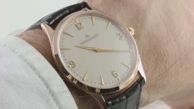 *перевести видео можно в Яндекс браузере Ультратонкие часы Jaeger-LeCoultre Master Q1342420 выполнены в корпусе диаметром 38 мм из розового золота 18 карат, который обрамляет бежевый циферблат на новом коричневом ремешке из кожи аллигатора с застежкой из розового золота 18 карат. Функции включают часы и минуты. Толщина часов также составляет 6,6 мм, а расстояние от выступа до выступа составляет 44,7 мм.